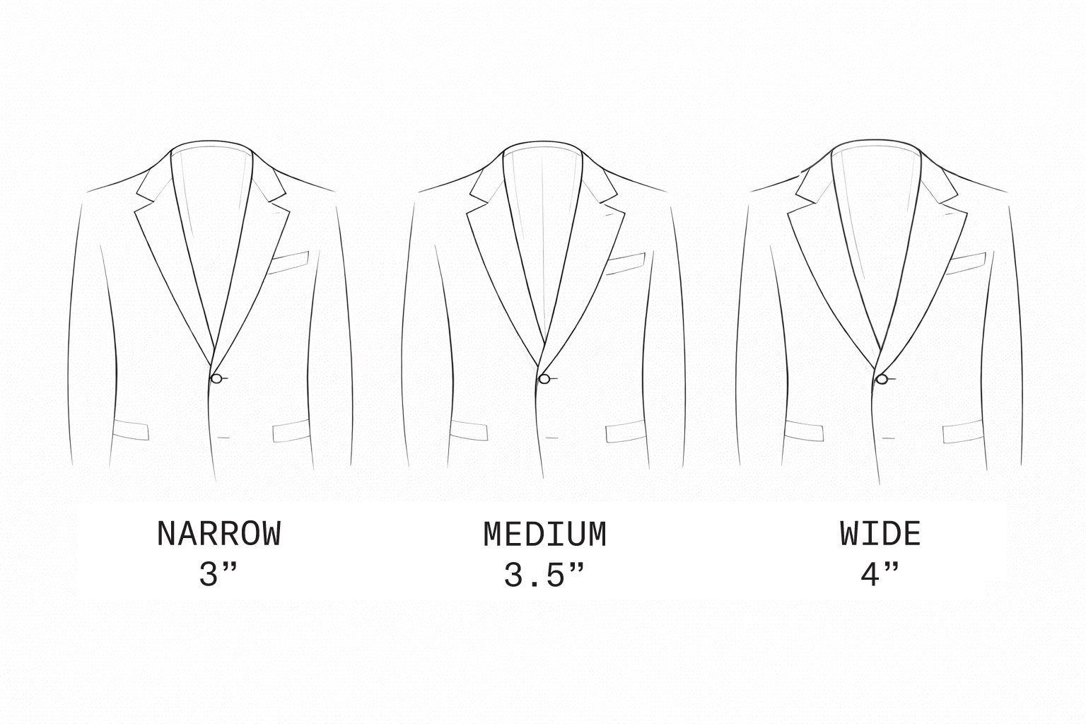Notch lapels are the most versatile and can suit any occasion equally. Wider lapels are bold and commanding; narrower lapels are more understated and restrained. Lower gorges are a more vintage look, but flattering for shorter necks. Higher gorges tend to look younger and more modern but are better for longer necks to maintain a more proportionate frame for the head.