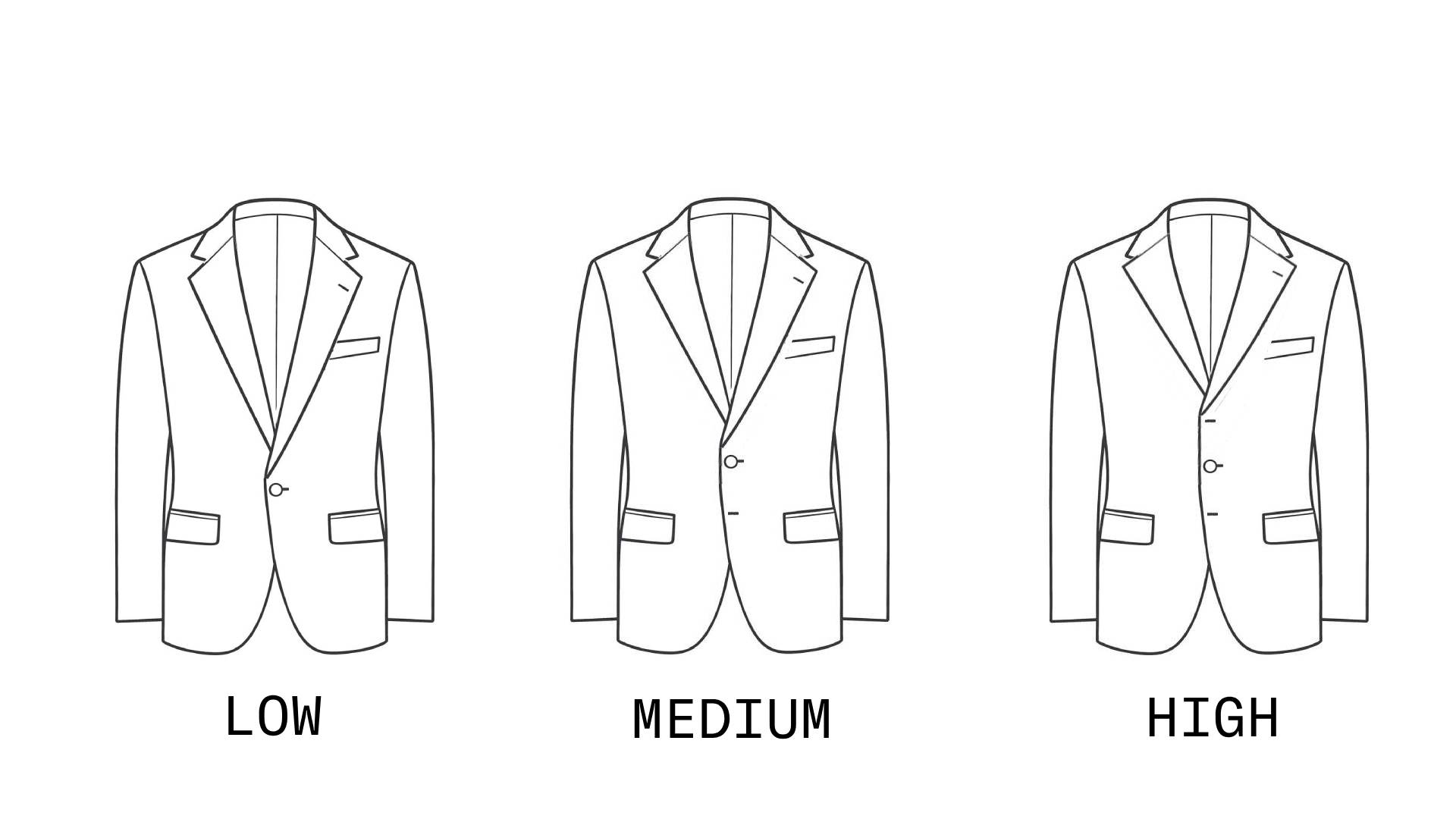 A lower button stance shows more shirt, ‘V’ lenghtening the torso and attracting the eye and implied musculuarity to the chest. A higher stance lengthens the legs by shortening the torso and attracts the eye to the shoulders and neck.